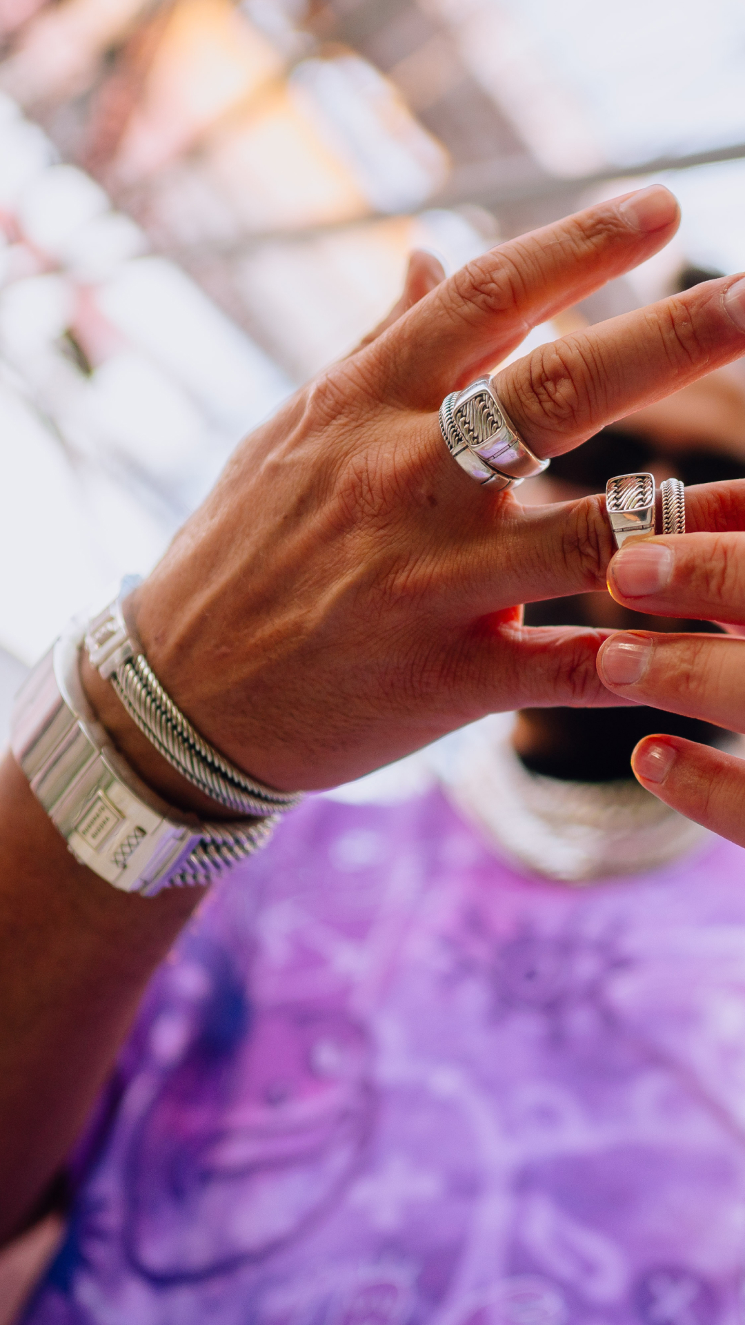 This collection pays tribute to our legendary Stiff bracelet, one of our first designs and La Fuente's very first Buddha to Buddha bracelet, which holds incredible personal value to him. The designs combine the Stiff with our popular Edwin weaving. Crafted from recycled 925 silver, its striking presence demands attention while telling a story of ambition, milestones, creativity, and relentless drive.