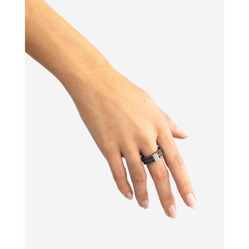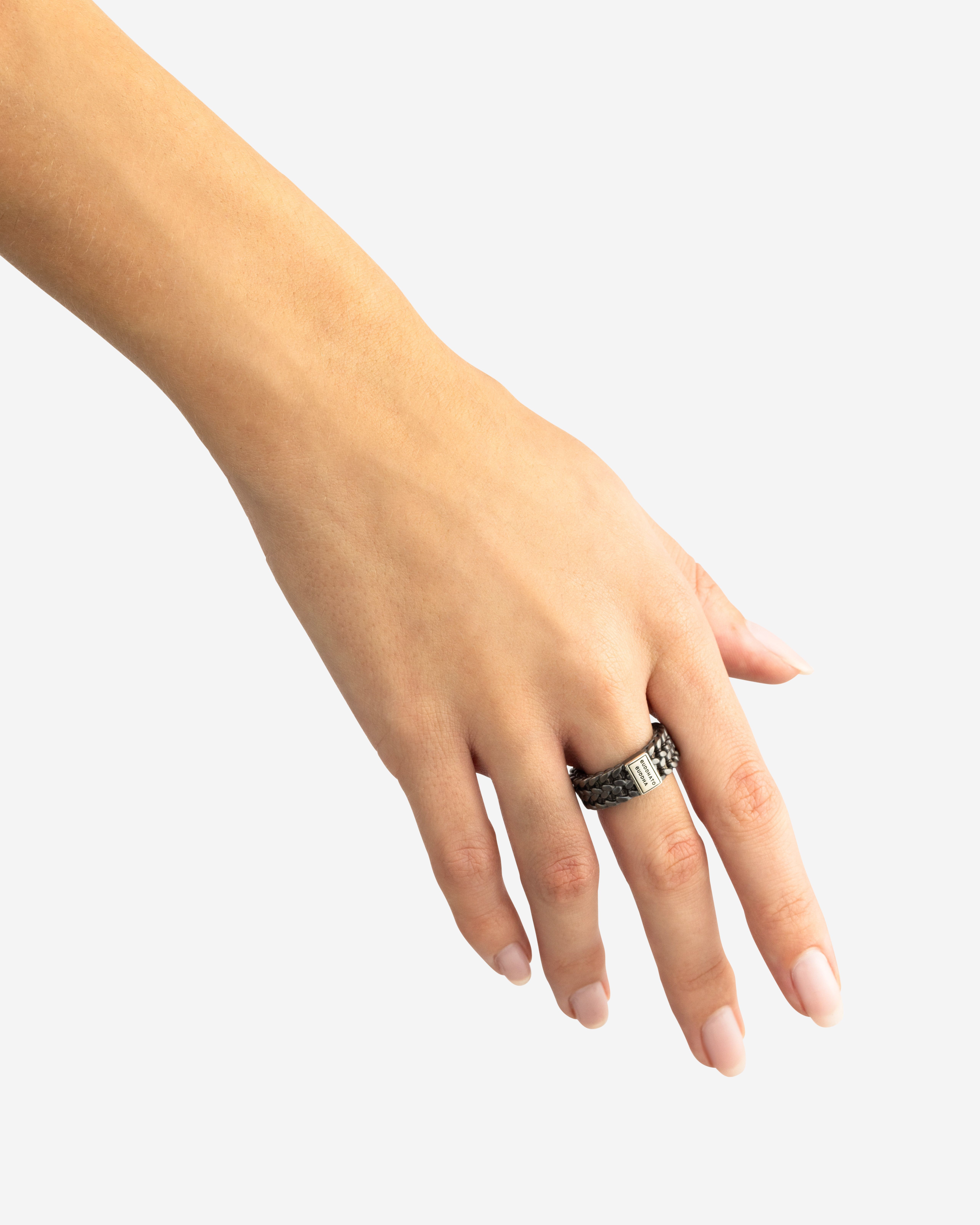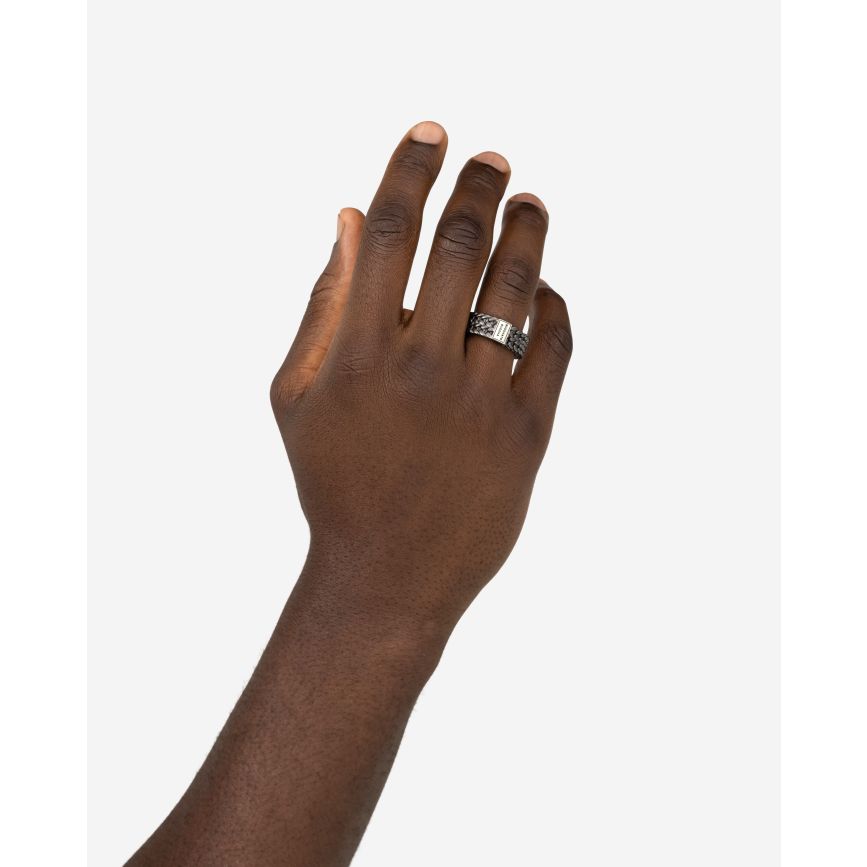 The Julius Black Rhodium ring is based on a particular traditional weave pattern, combined with a special matte rhodium finish and polished silver details. Your lifestyle and the natural elements determine the look of your jewellery as time goes by, creating a raw, vintage appearance that is a personal statement formed by your journey through life. It is a powerful yet stylish addition to your collection. The Julius Black rhodium ring is classed as a wider ring. Please note: This unique rhodium finish has been designed so that your jewellery takes on a vintage appearance over time. We believe everything in life should be celebrated. Celebrate with our jewellery!