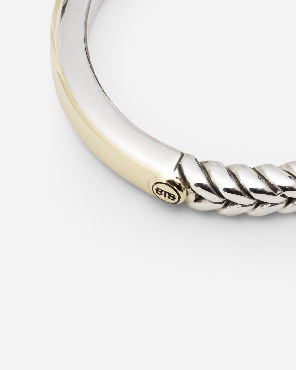 The Barbara Small Dual Ring in Bicolor is recognizable by a smooth side and a woven, iconic Barbara texture. This ring is perfect for creating your own story, as it is engravable. The Barbara Small Dual Ring is smaller than the Barbara Dual Ring but wider than the Barbara Mini Dual Ring. The depth and elegance of the Barbara weaving, combined with the gold and silver design, make this ring timeless and versatile, perfect for mixing with other jewelry. Designed in Amsterdam and sustainably produced in Southeast Asia. Are you ready to celebrate life by treating yourself or someone else to this powerful piece of jewelry?