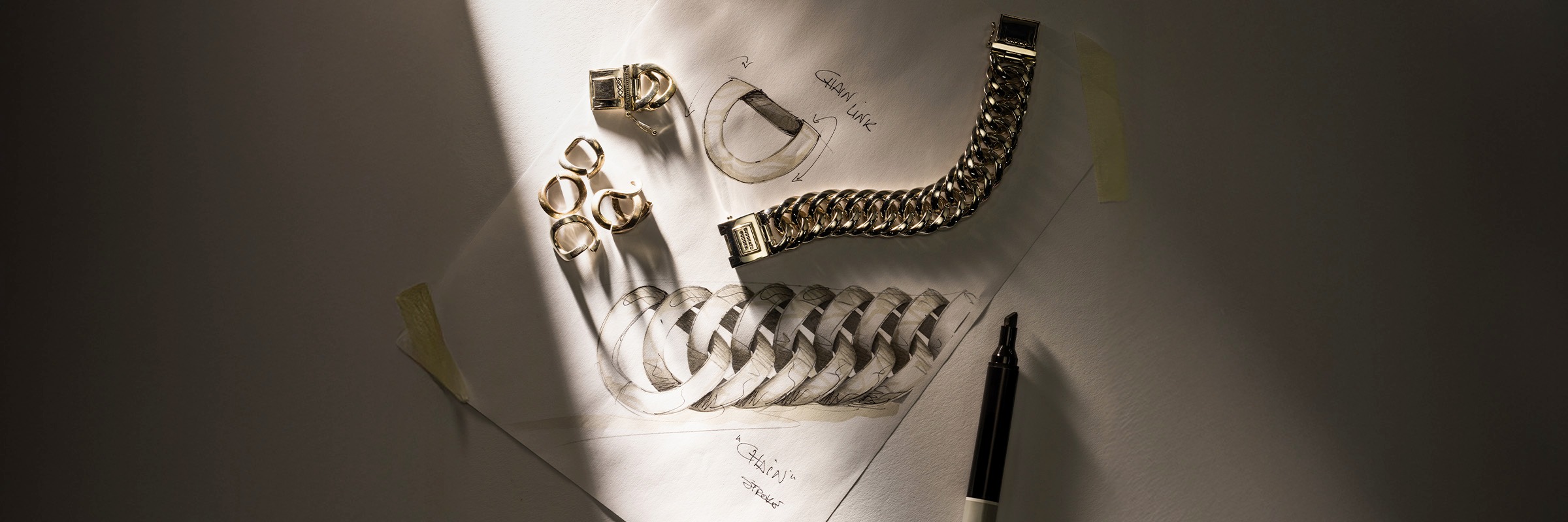 Our jewelry is made from recycled 925 sterling silver and 14-karat gold, which are heated and mixed to form solid bars and then processed into wires and links. Each link is hand-woven into a unique design, with techniques such as hammering, stretching, and twisting adding character and depth. Oxidation creates the distinctive look; Black Rhodium jewelry is additionally coated with rhodium for a dark, powerful finish. Finally, each piece of jewelry is carefully polished for a perfect finish, a traditional process that combines tradition and precision.